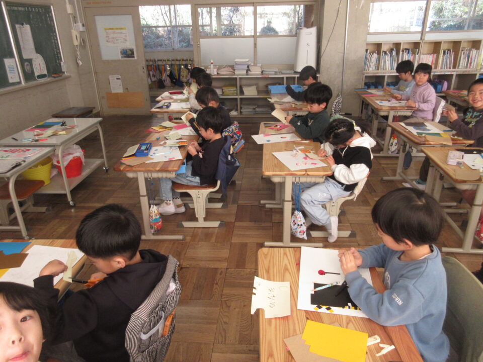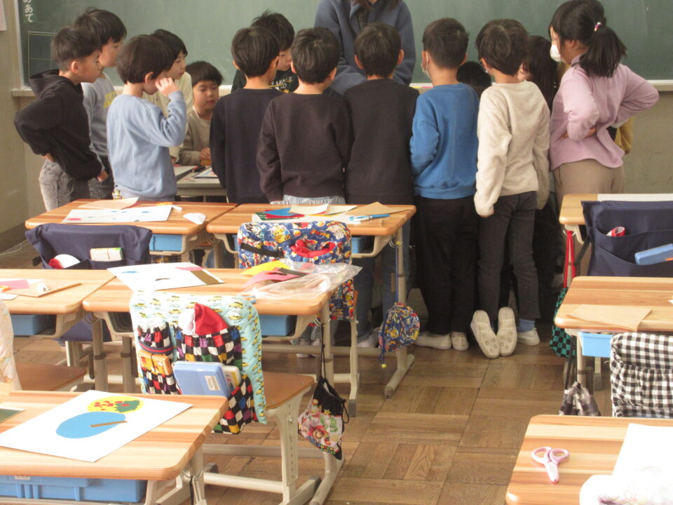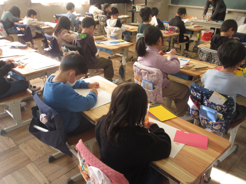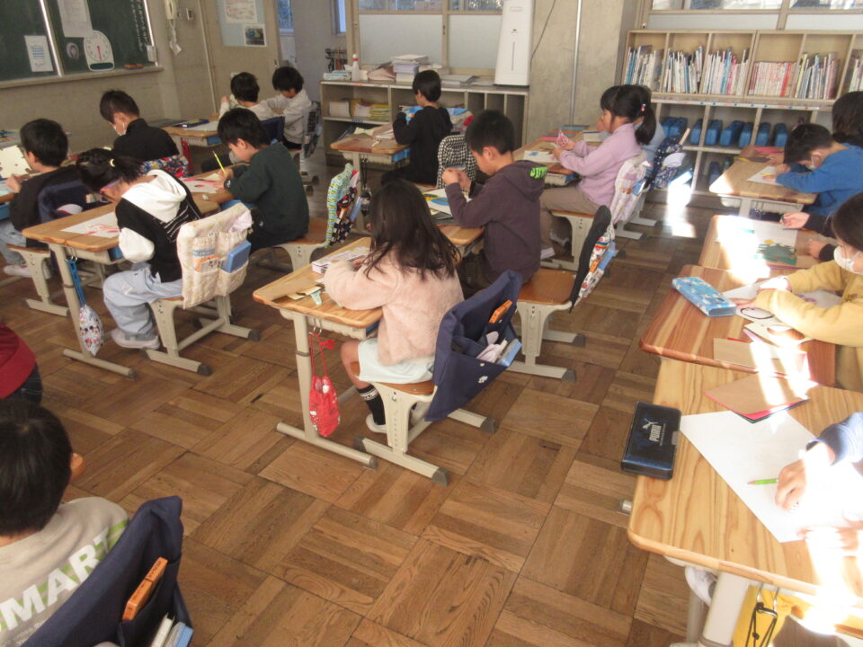 1年生の教室では図工の版画をしていました。ちょうど下絵から色を付ける(シールを貼る)場面でした。細かい下絵の通りにできるかな。出来上がりが楽しみですね。