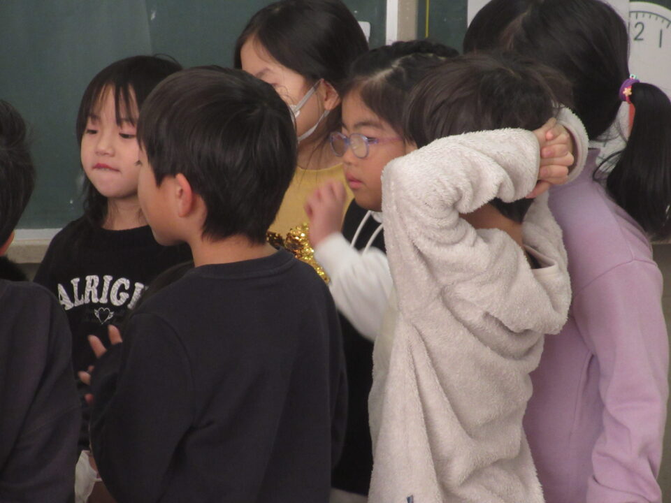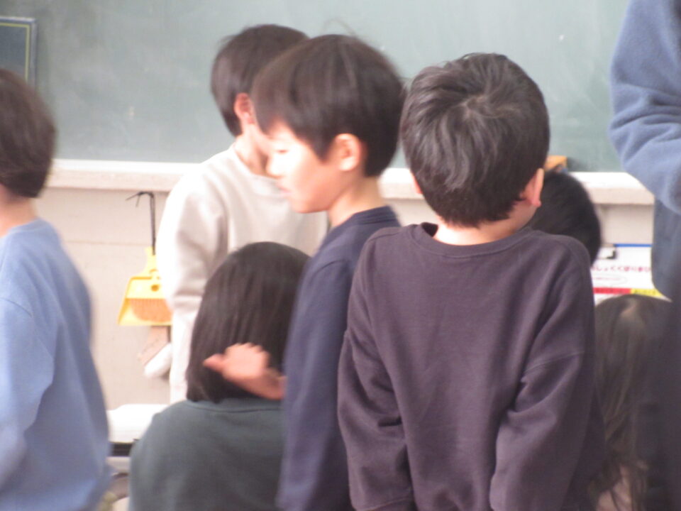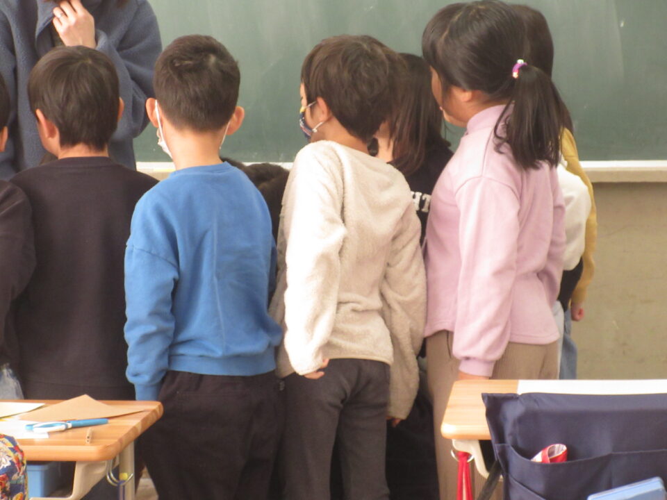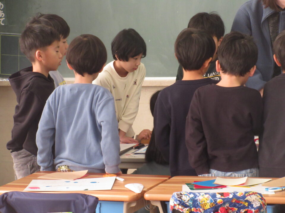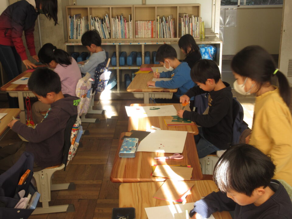 1年生の教室では図工の版画をしていました。ちょうど下絵から色を付ける(シールを貼る)場面でした。細かい下絵の通りにできるかな。出来上がりが楽しみですね。