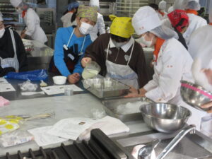 限られた時間の中でしたが、下準備や片付けなど、相可高等学校食物調理科のみなさんに各班ごとにサポートしていただきました。高校生のみなさんにやさしく教えていただいたり、お話をしていただいたり、調理だけでなく子どもたちは楽しい時間を過ごせたようです。