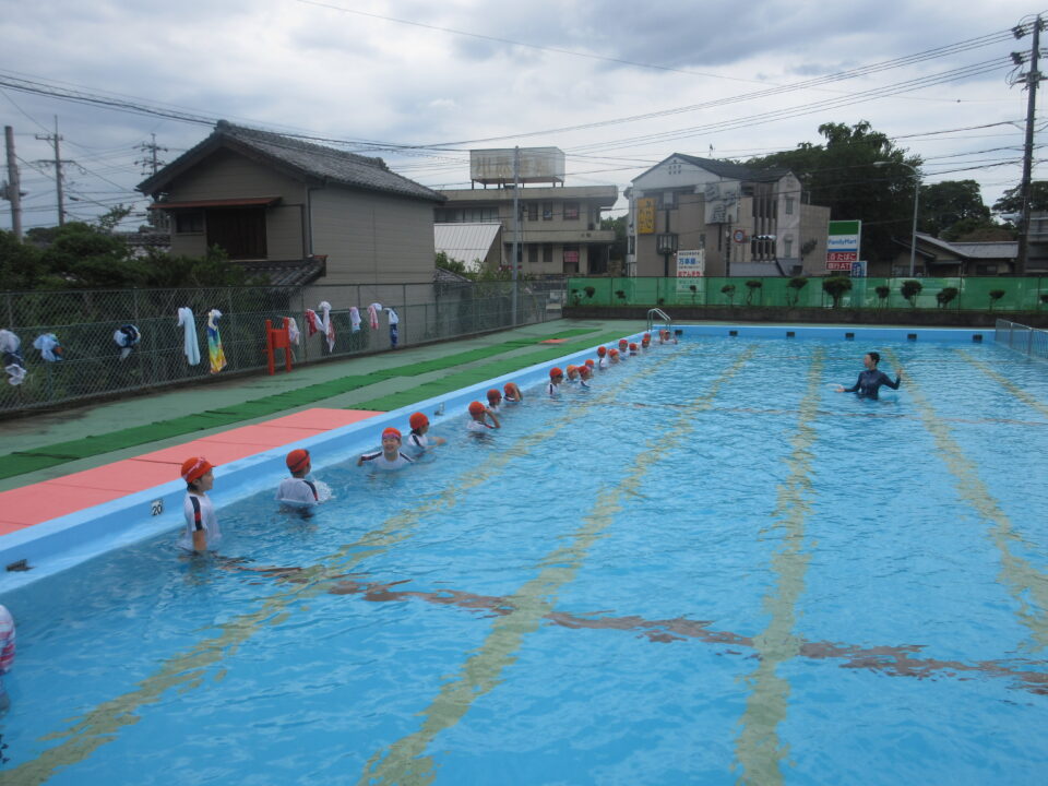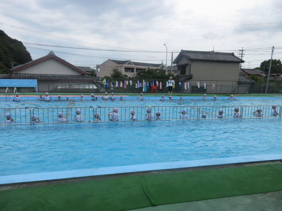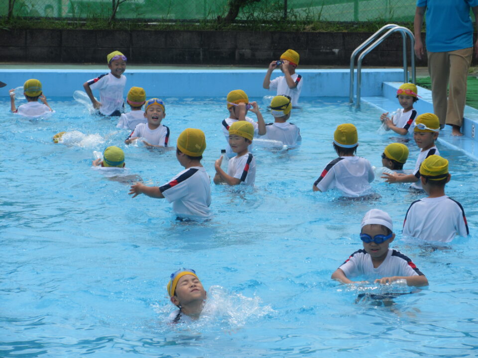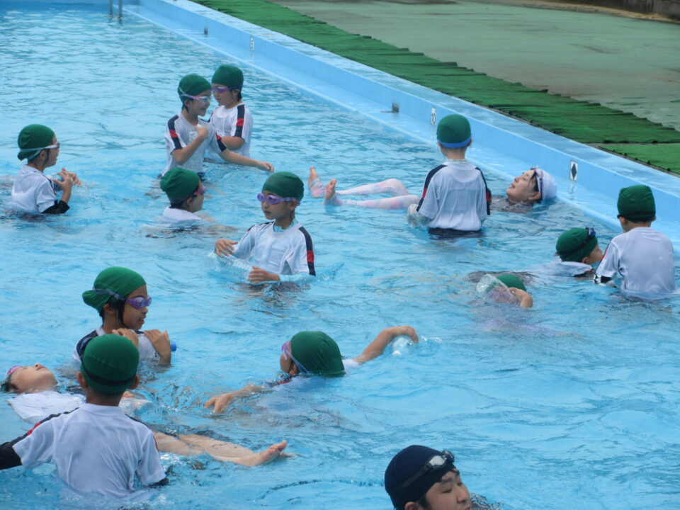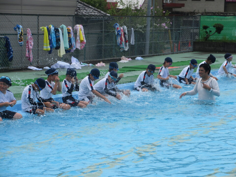 今年のプールもいよいよ最後となりました。今日は着衣水泳と言って、水難事故にあったときに身の守り方を少しでも体験しておく意味もあり、通常の水泳とはちょっと違う感じもします。水着の上に体操服を着て、さすがに「重い」という声が聞こえてきました。それでもペットボトルをもって、抱えて?上手に浮かんでいました。