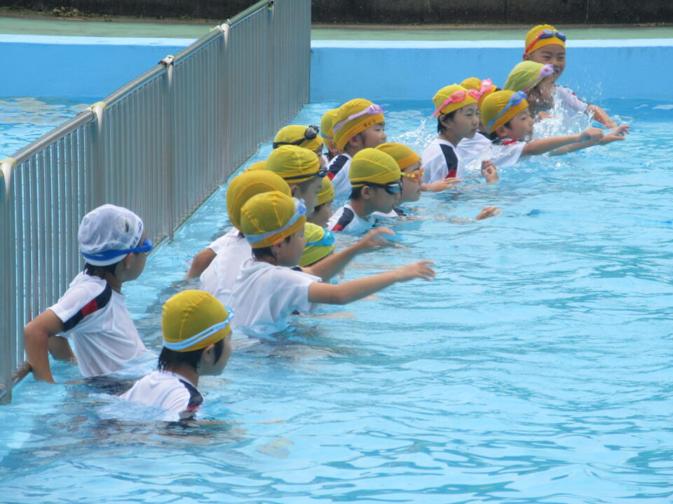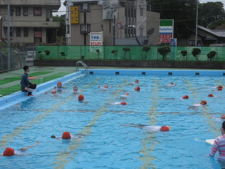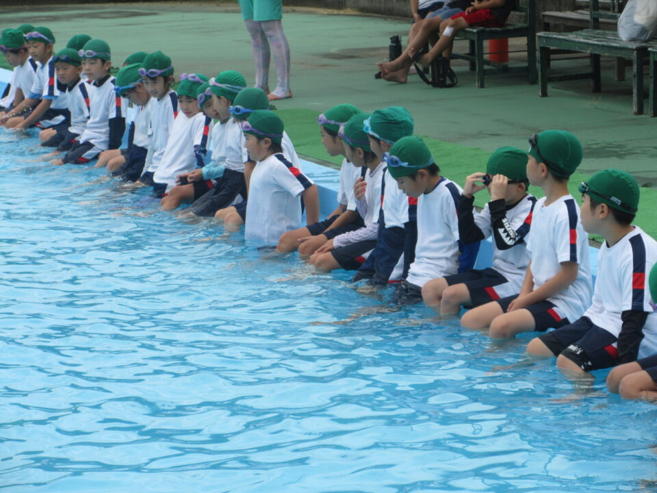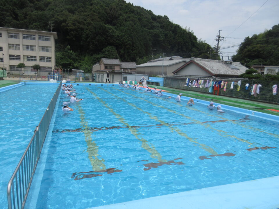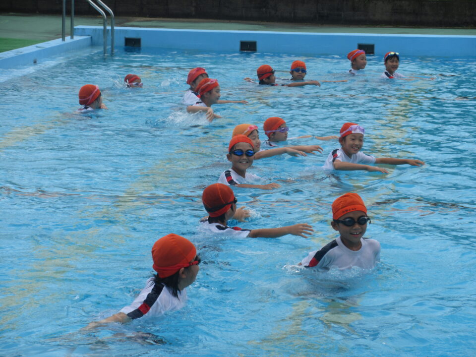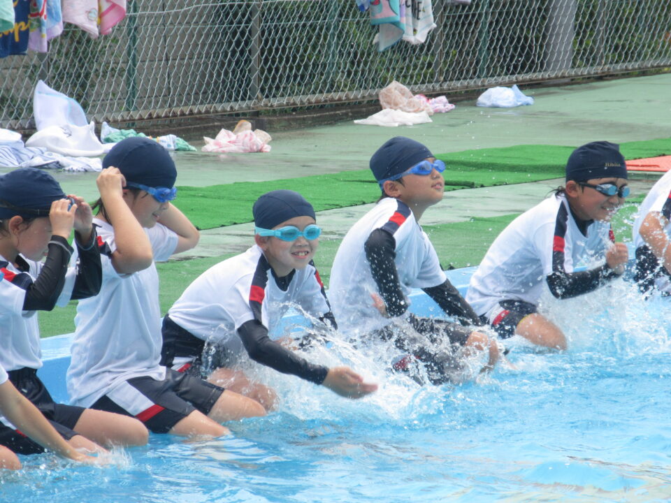 今年のプールもいよいよ最後となりました。今日は着衣水泳と言って、水難事故にあったときに身の守り方を少しでも体験しておく意味もあり、通常の水泳とはちょっと違う感じもします。水着の上に体操服を着て、さすがに「重い」という声が聞こえてきました。それでもペットボトルをもって、抱えて?上手に浮かんでいました。