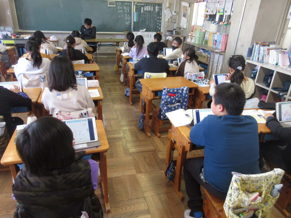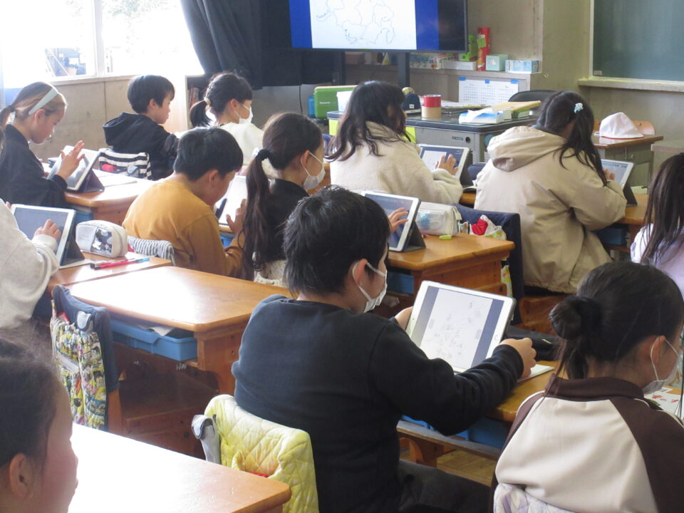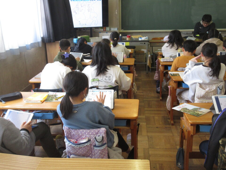卒業式の練習が始まっていますが一日中、練習ではありません。今日は4年生の社会です。冒頭、中部地方の県名を答える問題をしていました。場所と県名をタブレットで答えていきますが、思っていた以上に素早く取り組んでいました。結構、覚えている感じがしました。