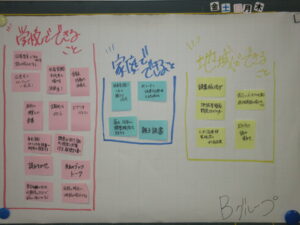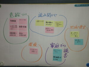21日(金)に、第3回いざわCS協議会が行われました。今回は参加した委員さんを2つのグループに分け、「子どもたちを読書好きにするために、学校・家庭・地域でできること」について協議を行いました。話し合ったことをそれぞれ模造紙にまとめ、交流しました。