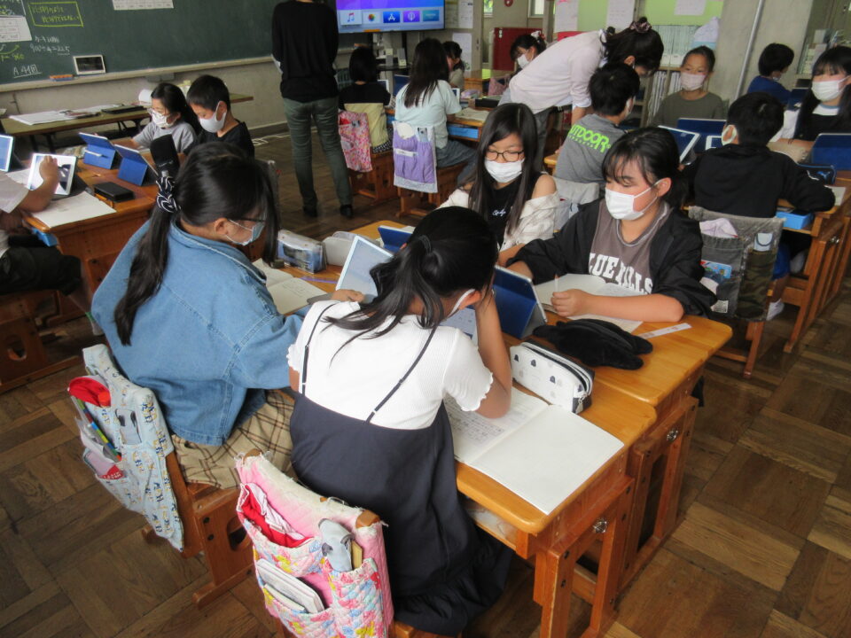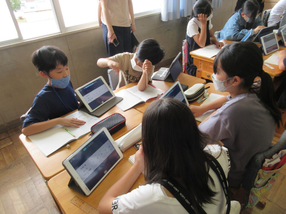4人グループになって、自分が考えたこと、わからなかったことを伝え合います。子どもたちの学び合いの時間です。