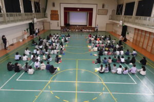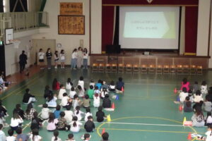 1年生は、みんなの前で名前と好きなものを言って自己紹介をしました。続いて、児童会役員も自己紹介をしました。役員となって頑張る思いが伝わってきました。続いて、環境ISGから掃除の仕方について発表がありました。スライドを映しながら丁寧に説明してくれました。みんなで気持ちの良いきれいな学校にしていきましょう。