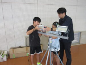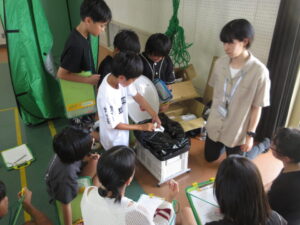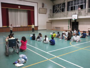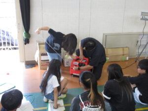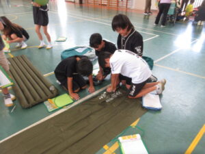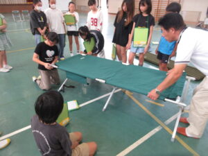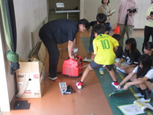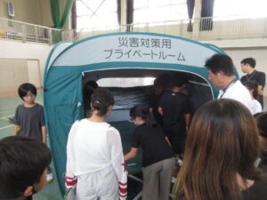 まずは、6年生と一緒に「避難所について知ろう」と題して、松阪市役所防災対策課の方に、避難所についてのお話をしていただきました。その後は3つのグループに分かれ、避難所生活に必要なものについて体験しました。