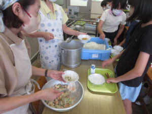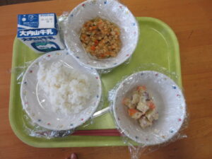 給食も、災害時を想定してお皿を汚さないように、ラップをして食べました。
