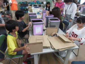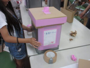 午後は、「一斗缶を使った簡易トイレづくり」です。防災ボランティア春告鳥のみなさんに、ご協力いただきました。保護者や地域のボランティアの方にもお手伝いしていただきながら、それぞれが簡易トイレを作成しました。