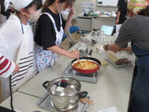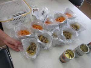 いよいよお楽しみの、防災食づくりです。食材は、缶詰等を国分グループさんからご提供いただきました。どうもありがとうございました。器も新聞紙にナイロンをかけて作りました。