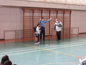 その後は体育館で、防犯教室を行いました。校外で見知らぬ人に声をかけられたり、どこかに連れていかれそうになった時は、どのようにしたらよいかを教えていただき、その後は、高学年代表の子どもが実技訓練を行いました。