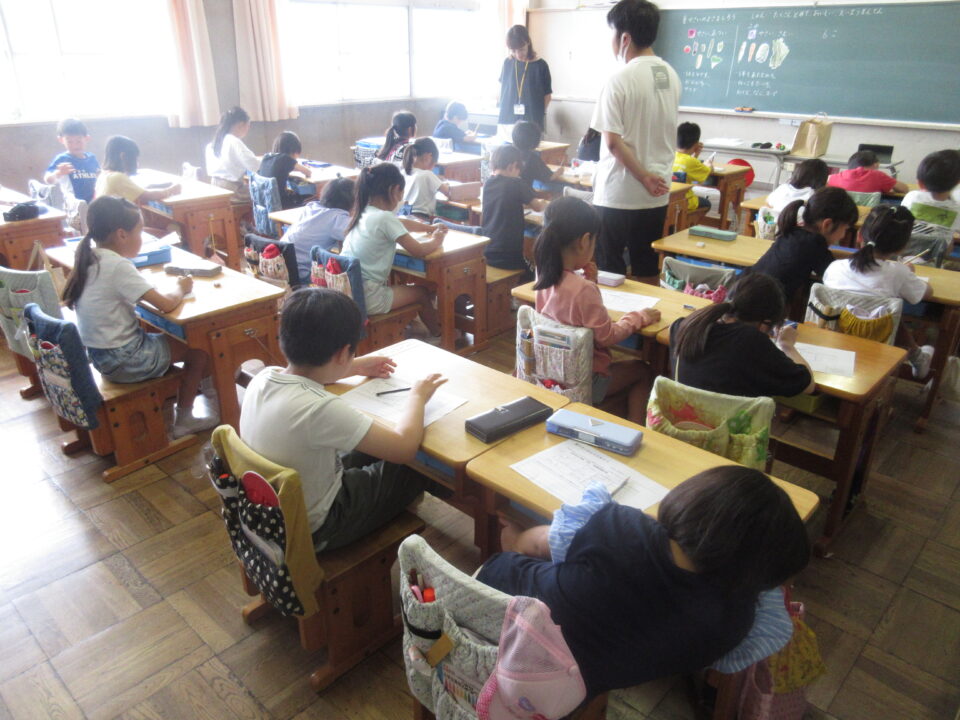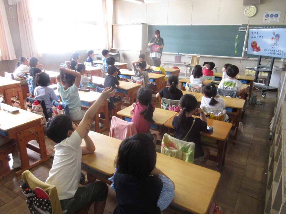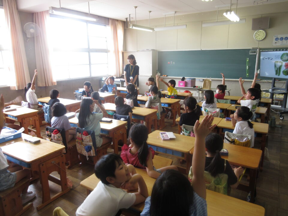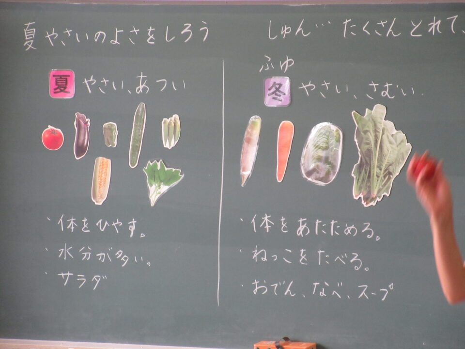 2年生で食育の授業がありました。ちょうど育てている野菜の話もあり、とても興味深く参加していました。