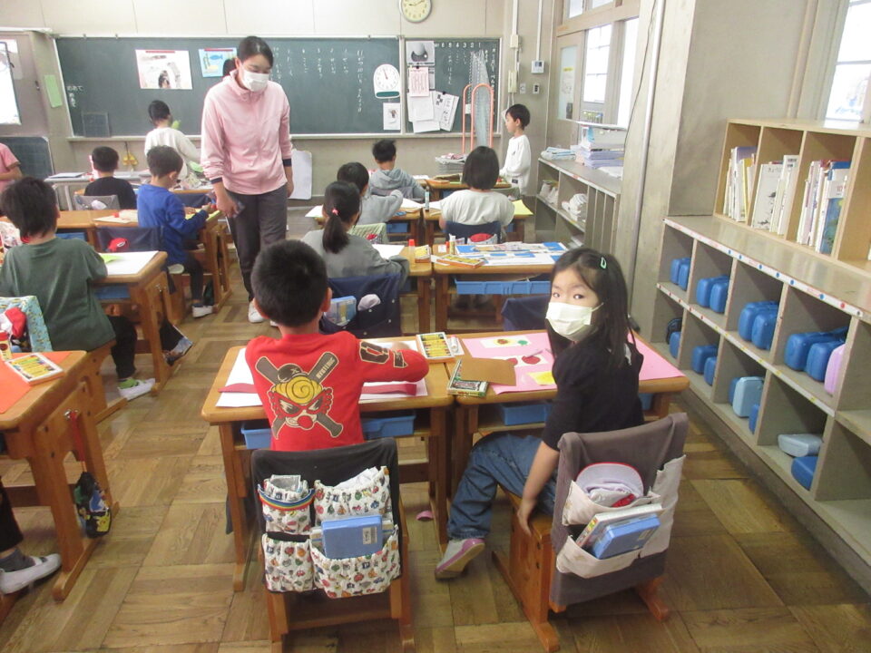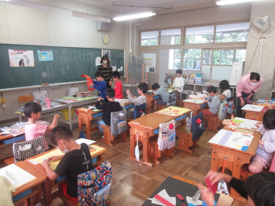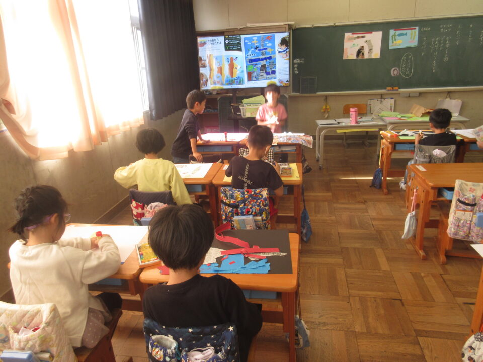 1年生はちぎり絵をしていました。色画用紙をちぎりながら台紙に貼っていきます。大小さまざまな形を考えながら貼っていきました。