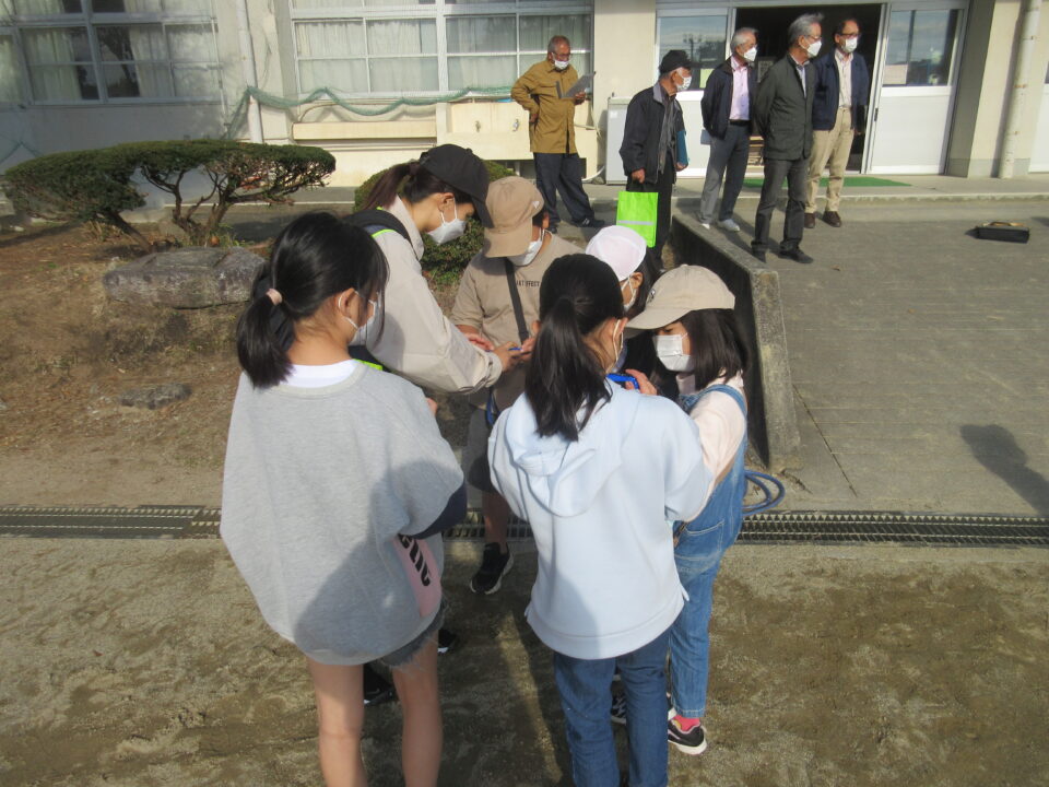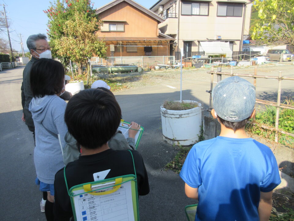 4年生が5つの班に分かれて、射和町のタウンウォッチングを行いました。市の地域安全対策課の方や自治会長さんをはじめ地域の方々に同行していただき、自分たちの住むまちを歩きました。自分の命、友だちの命を守るため、防災、防犯、交通安全の面で、危険な場所を確かめたり、役立つ場所や物がどこにあるのかを調べました。