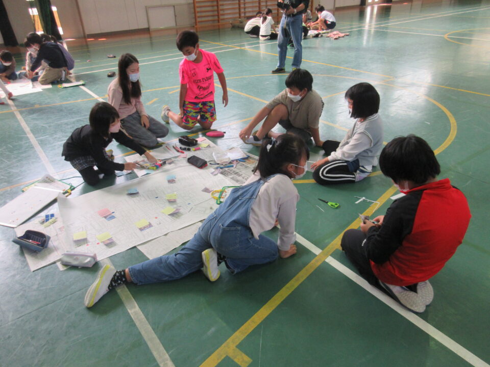 学校に戻ってからは、得てきた情報を地図上に表し「地域安全マップ」を作りました。現地で撮影した写真も貼り付けて、とてもわかりやすいマップが完成しました。