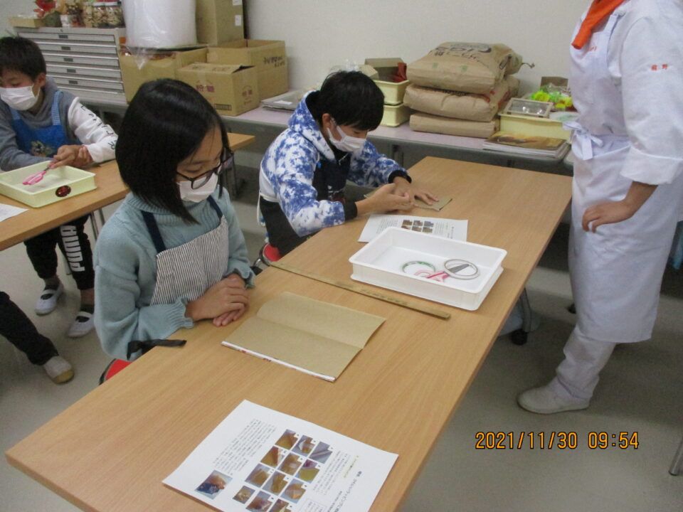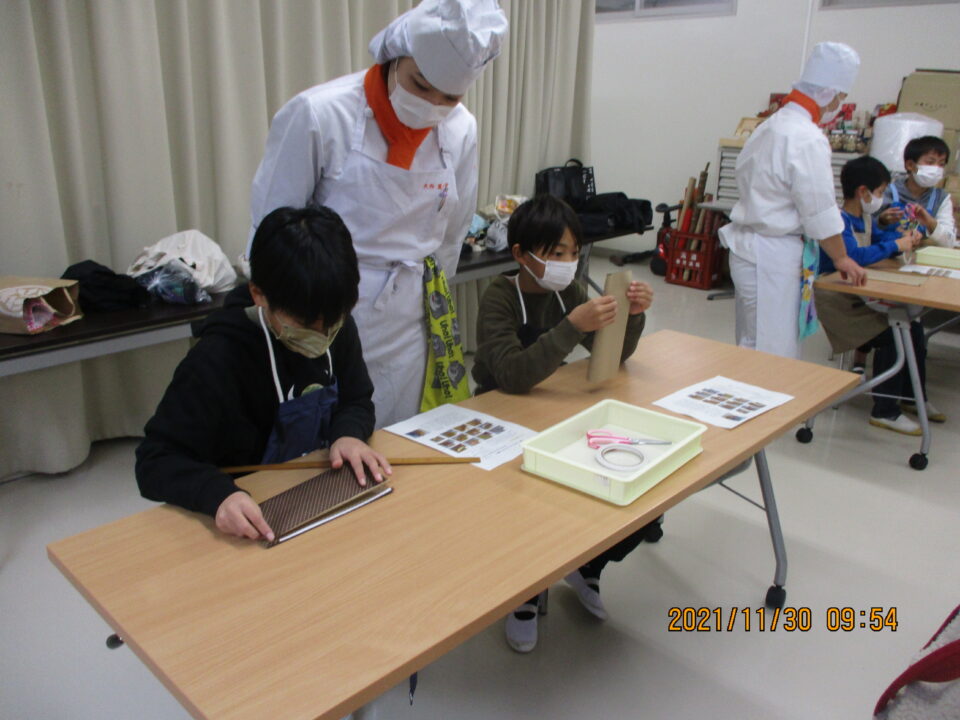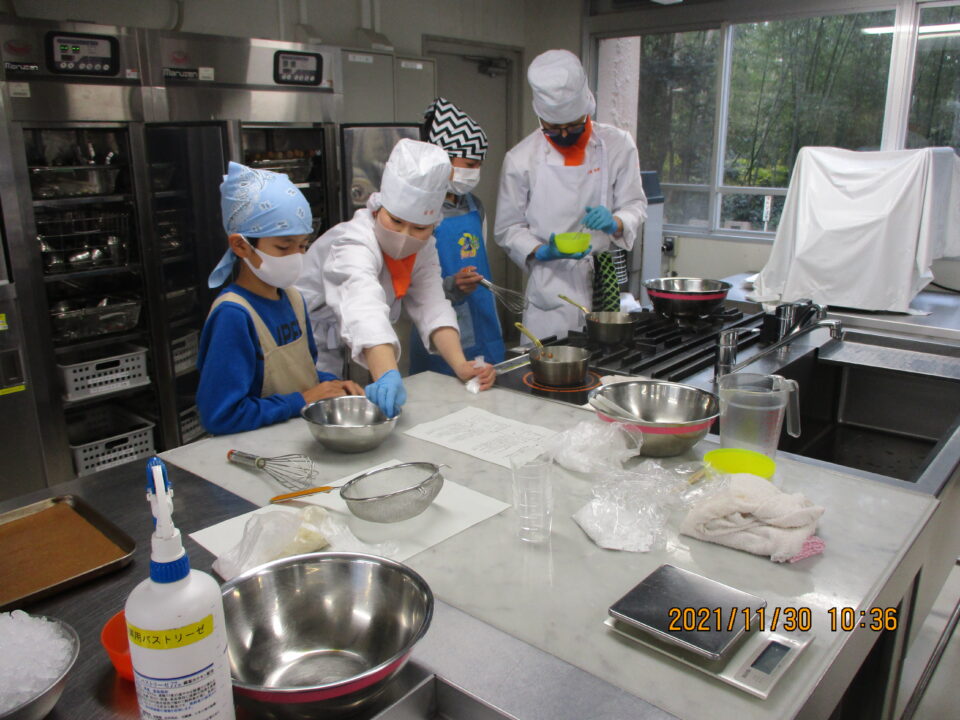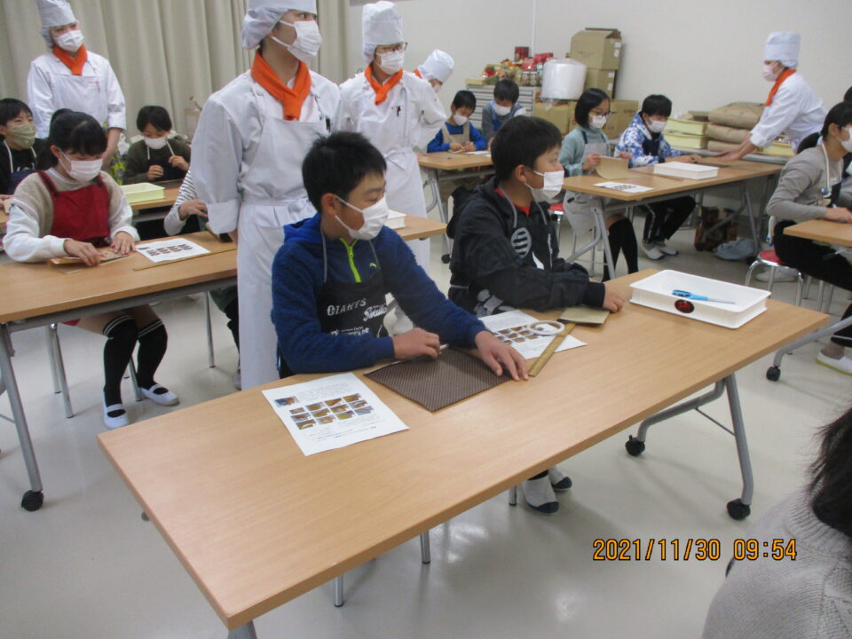 食物調理科の先生と高校生の皆さんにお世話になり、楽しみにしていた調理実習の体験をさせていただきました。オレンジミルクゼリーにスノーボールの調理、またラッピングの仕方を優しく、子どもたちをなごませながら親切丁寧に教えていただきました。食物調理科の皆さんは、子どもたちにとっては、あこがれの高校生になりました。