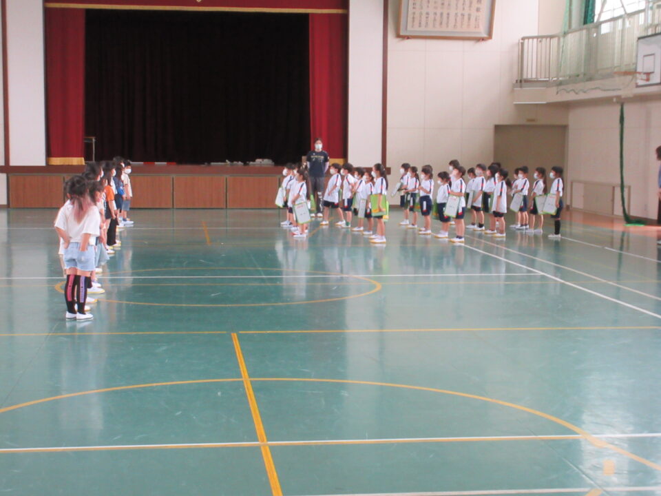 最後は1・2年生が体育館に集合し、1年生が2年生のみんなにお礼を言いました。今年1年間、1年生と2年生は一緒に活動する時間がたくさんあります。いっぱい触れ合って、成長し合い高まり合ってほしいと思います。(早速、運動会の練習が始まります。)