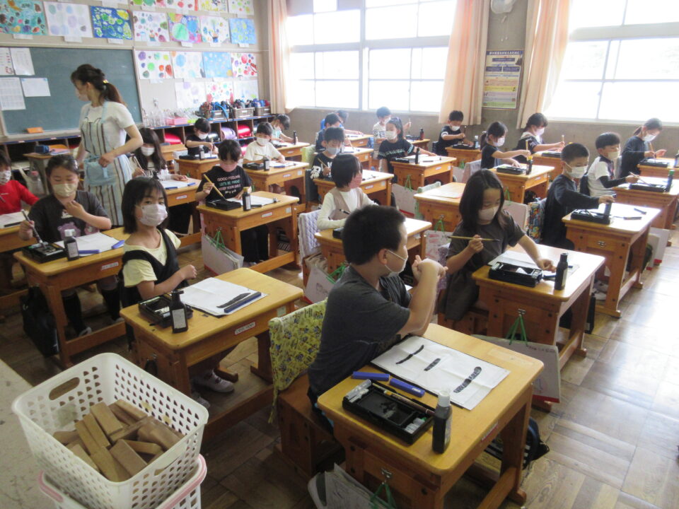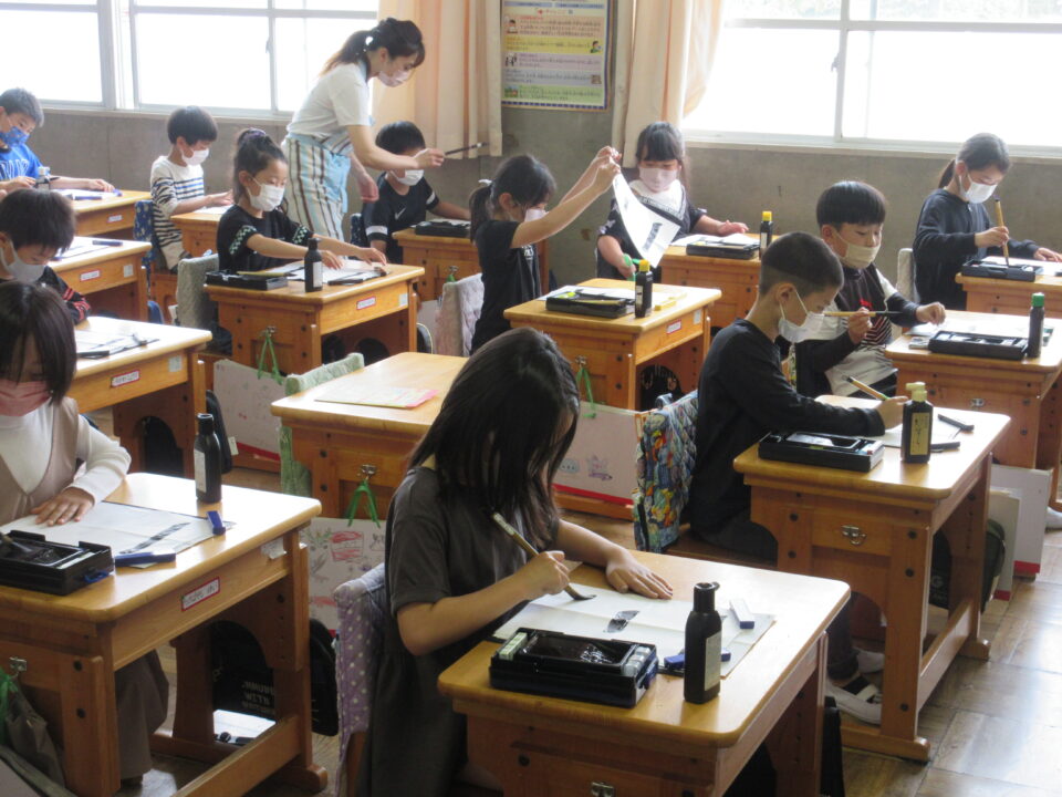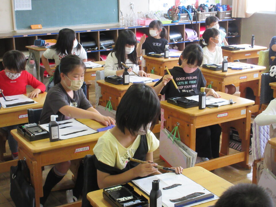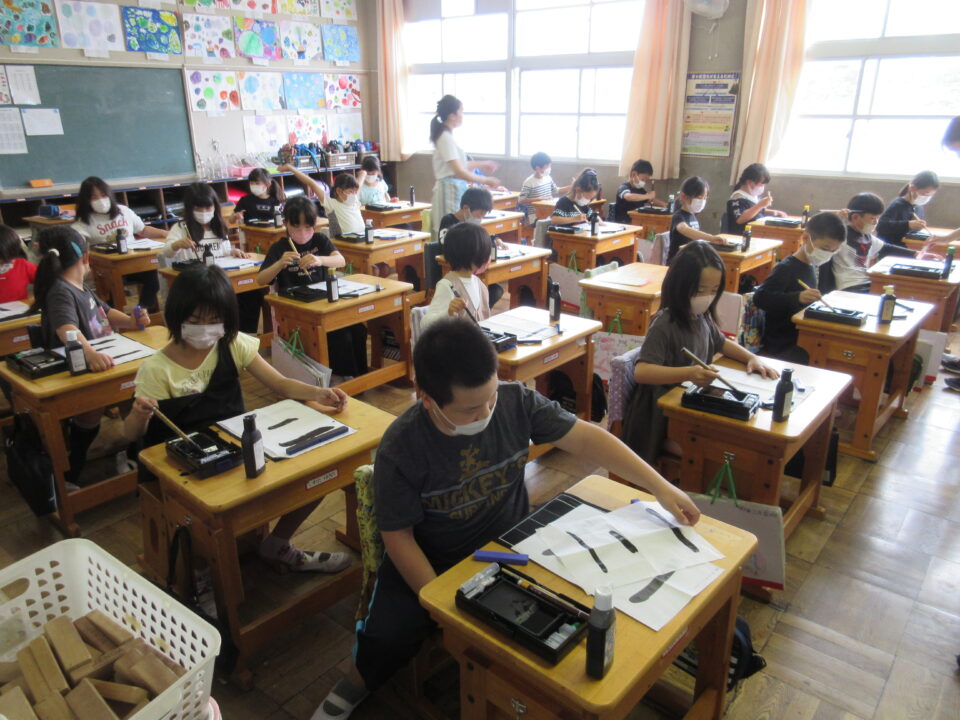 3年生。習字の時間です。準備や筆の使い方など、少しづつ慣れてきました。みんな真剣に書いています。