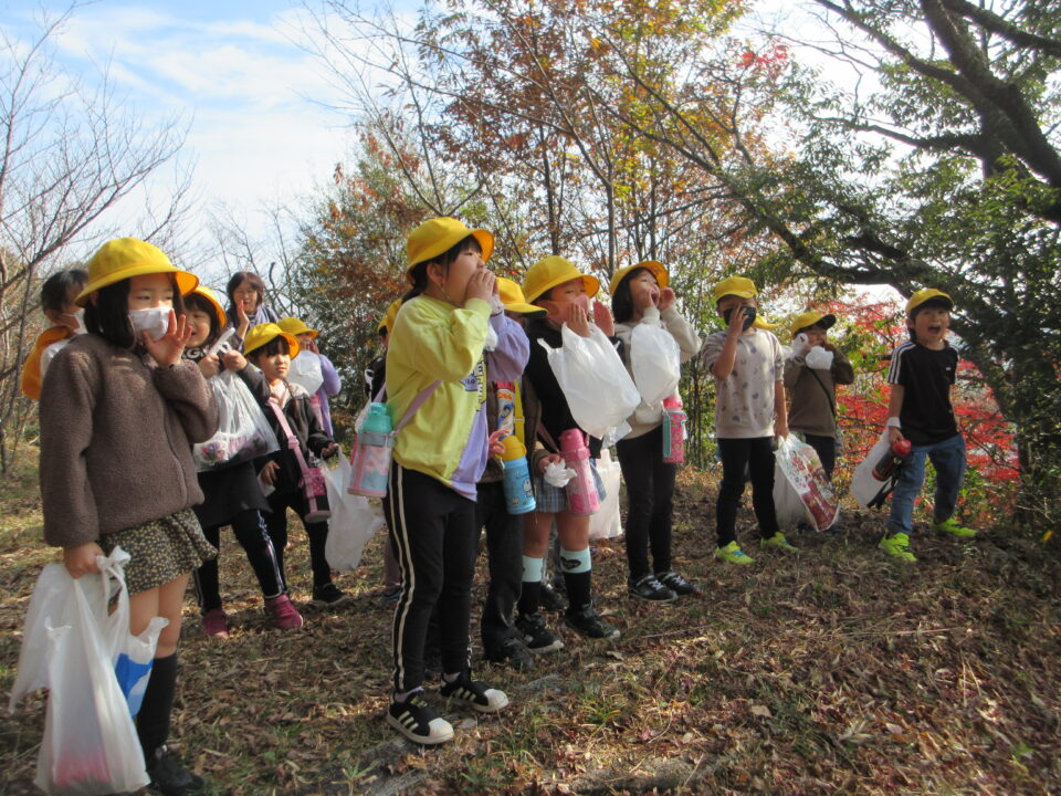 山の中の階段を登ると、木の隙間から射和小学校が見えてきます。小学校に向かって、元気に呼びかけます。
