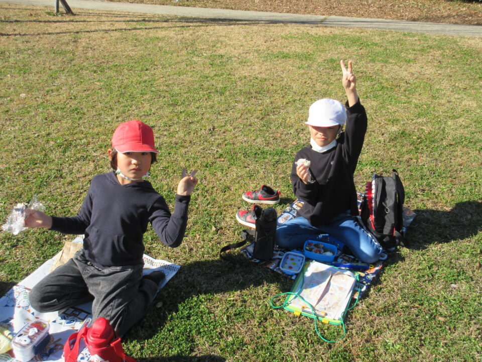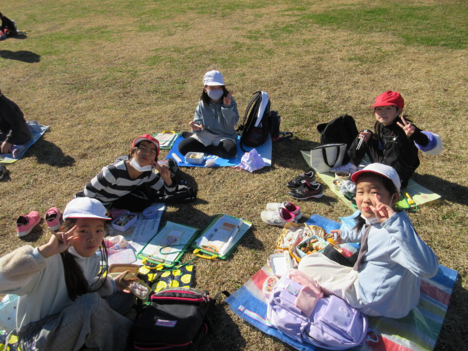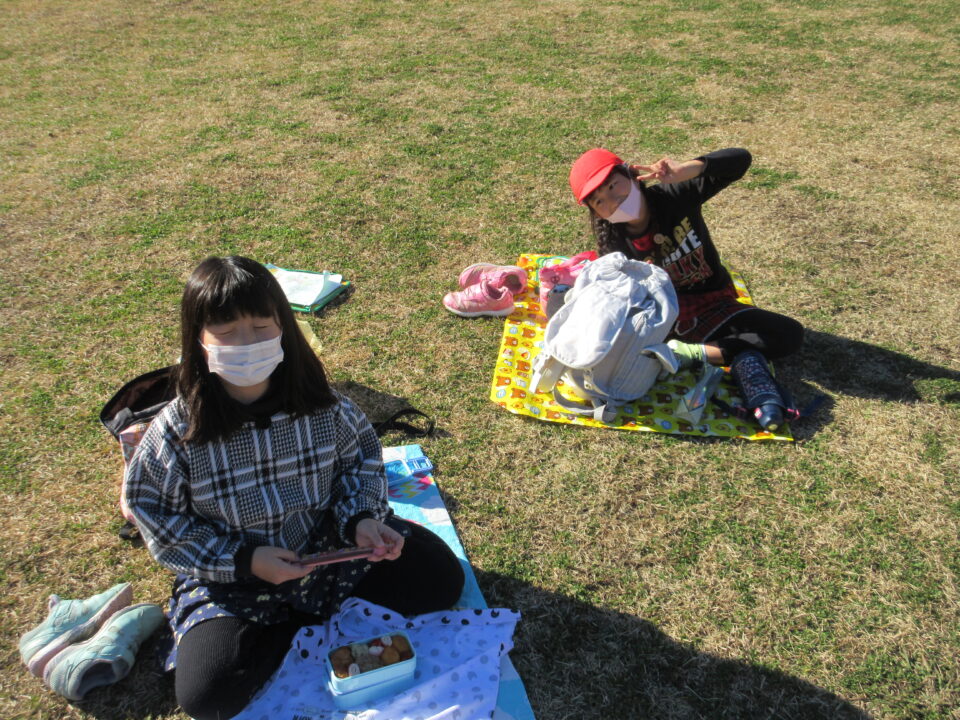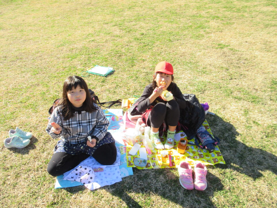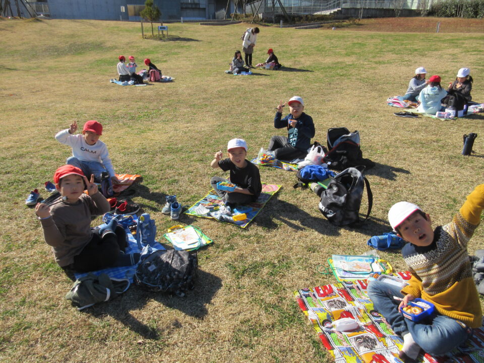 楽しい昼食とおやつタイムです。館内での昼食の予定でしたが、この時期にもかかわらず、暖かい天候に恵まれ博物館前の広場で楽しむことができました。