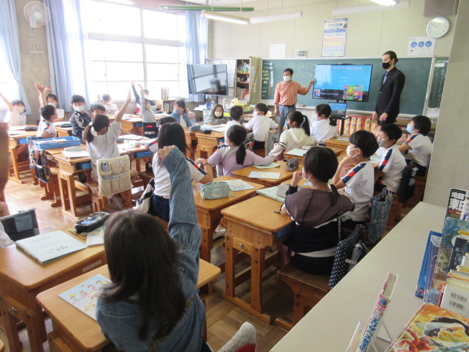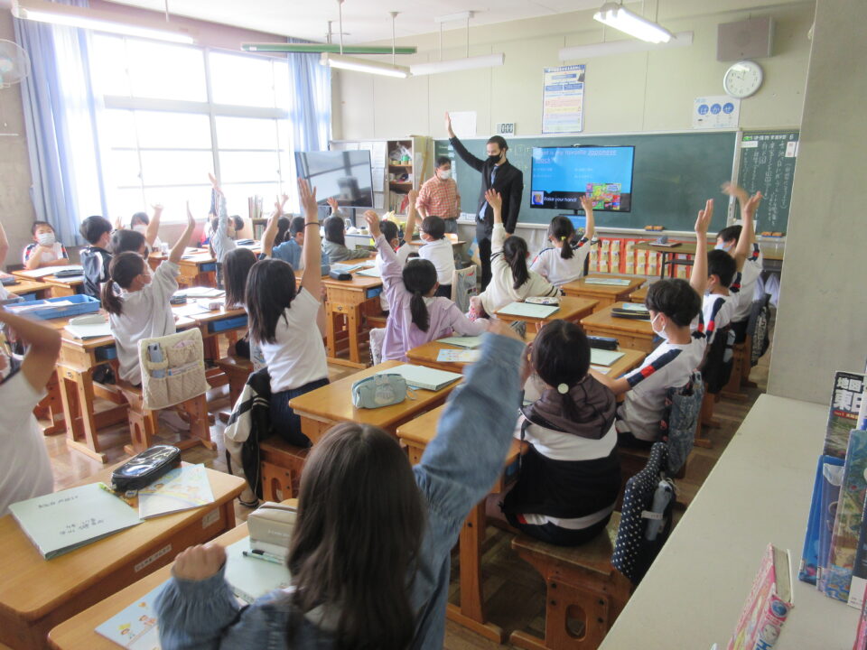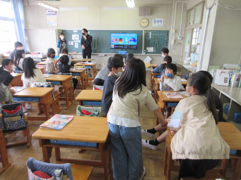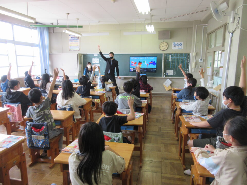 外国語活動の時間に、ALTの先生が来てくれました。今年度のALTの先生はアメリカ出身のモーガン先生です。モーガン先生は自分のことをクイズにしながら、自己紹介をしてくれました。みんなすっかり夢中になって、先生との出会いを楽しみました。どの教室も大いに盛り上がり、歓声が聞こえてきました。3・4・5年生の様子です。