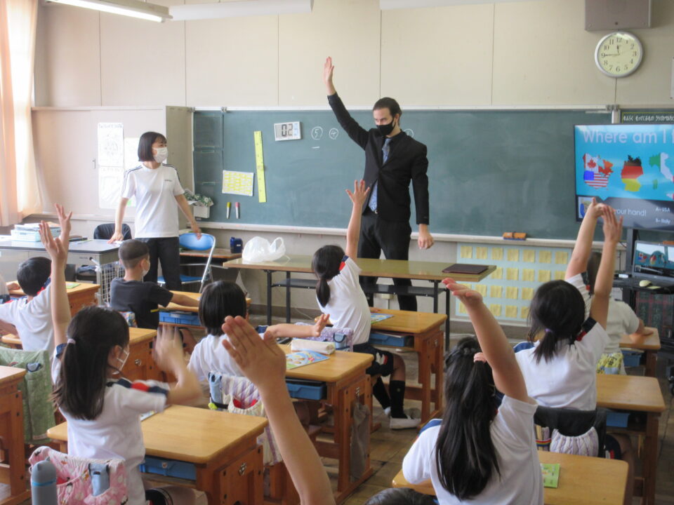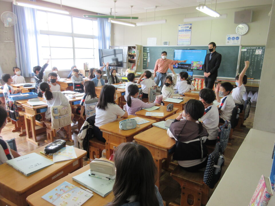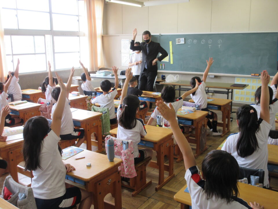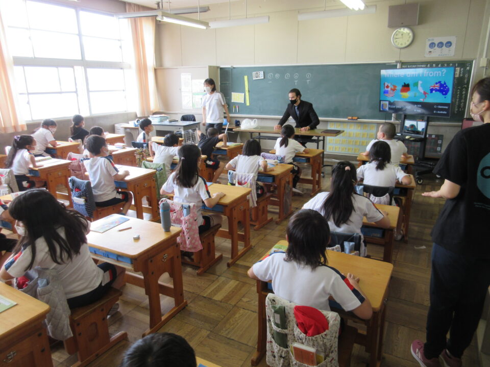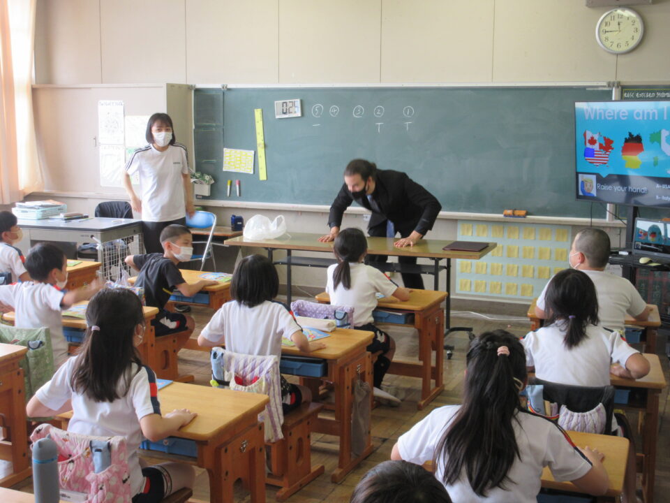 外国語活動の時間に、ALTの先生が来てくれました。今年度のALTの先生はアメリカ出身のモーガン先生です。モーガン先生は自分のことをクイズにしながら、自己紹介をしてくれました。みんなすっかり夢中になって、先生との出会いを楽しみました。どの教室も大いに盛り上がり、歓声が聞こえてきました。3・4・5年生の様子です。