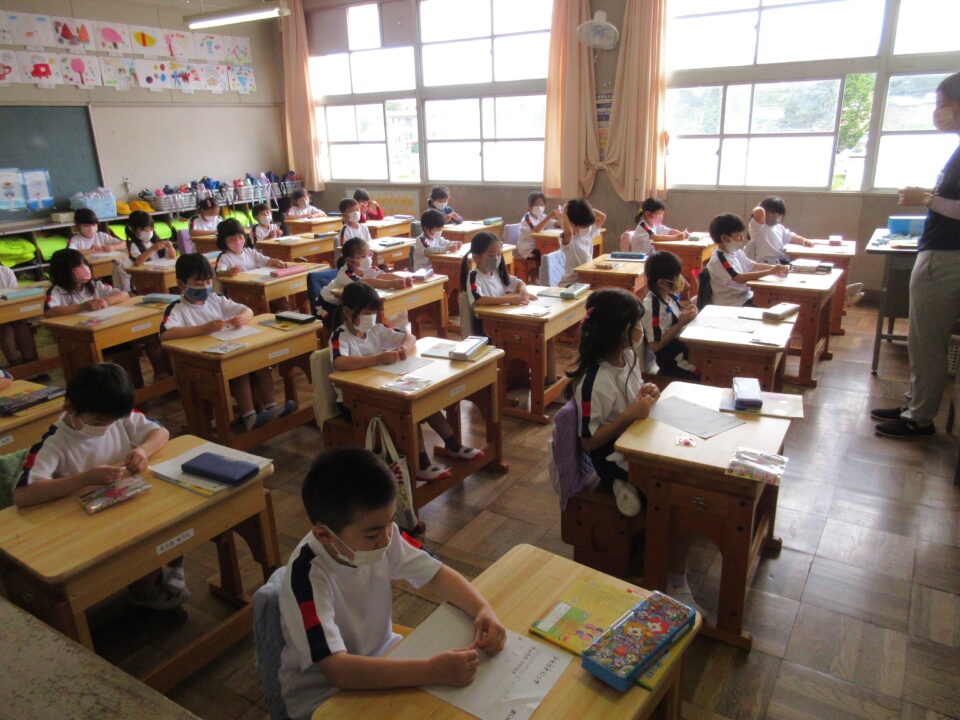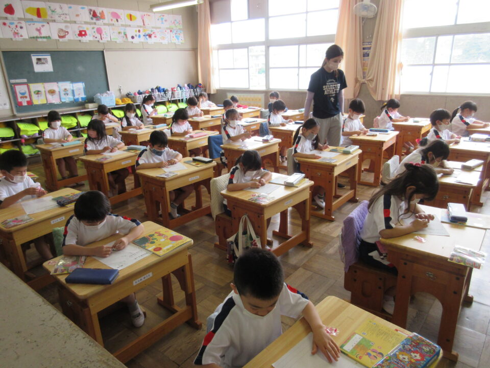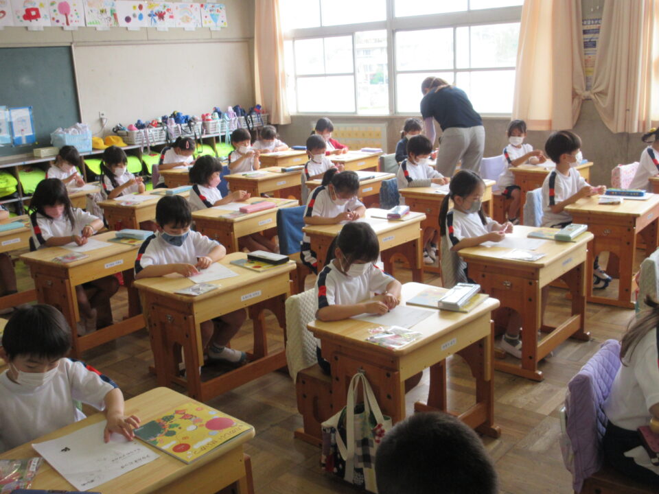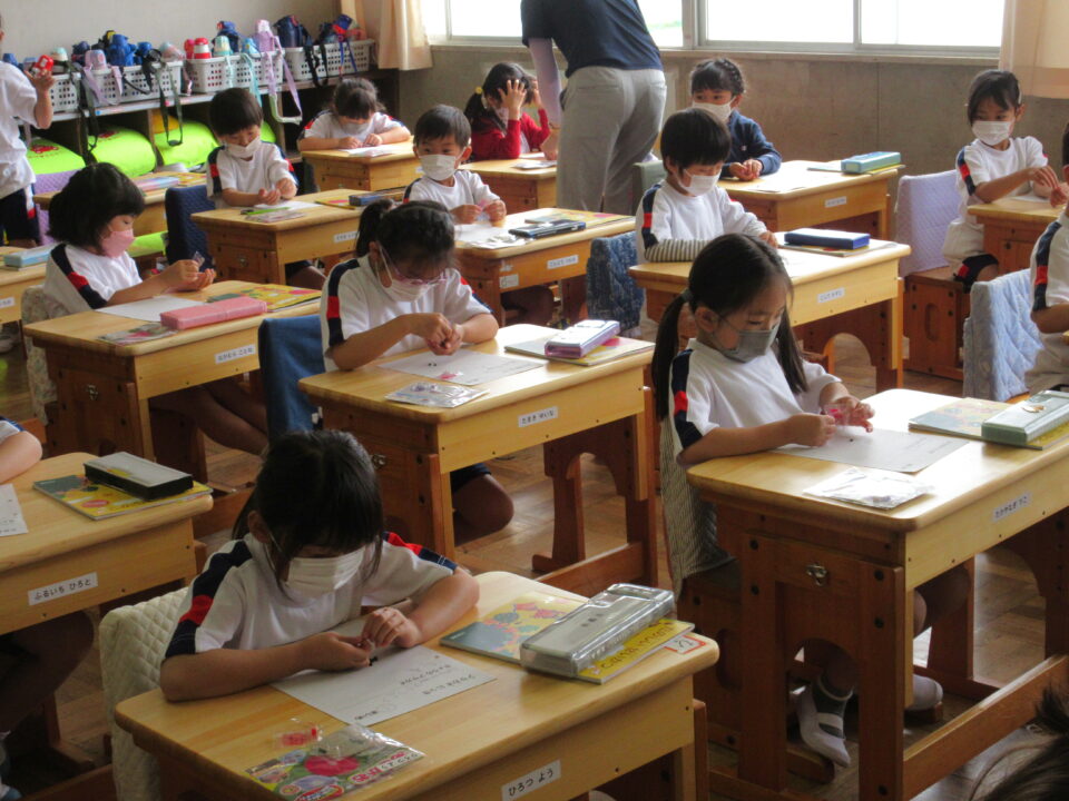 1年生は、朝顔の種の観察です。これから育てる朝顔の種をしっかりと見て、絵を書いていました。