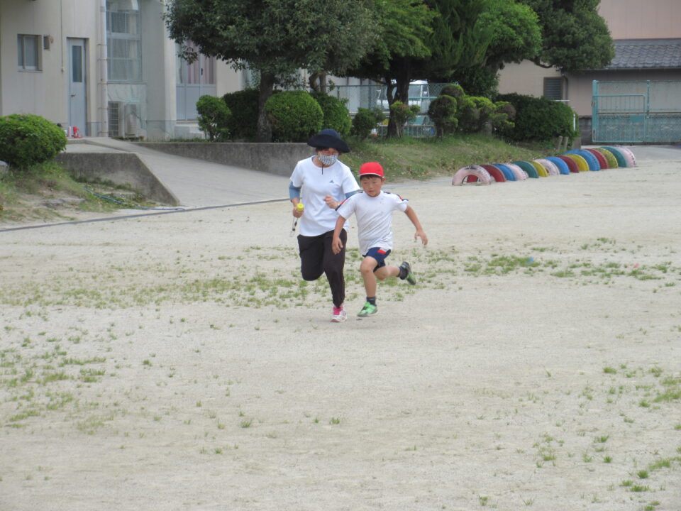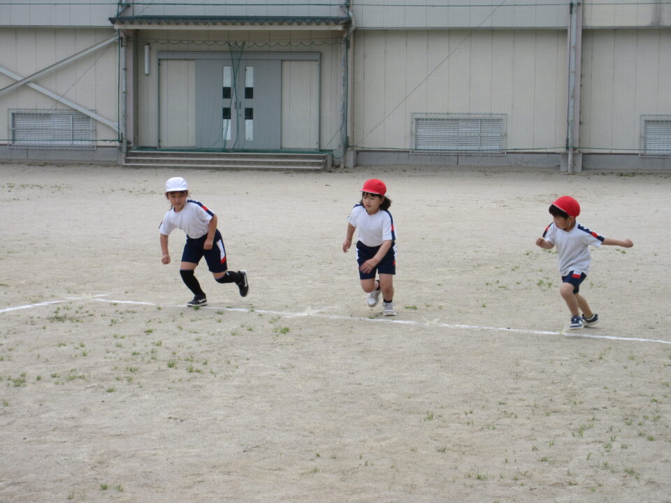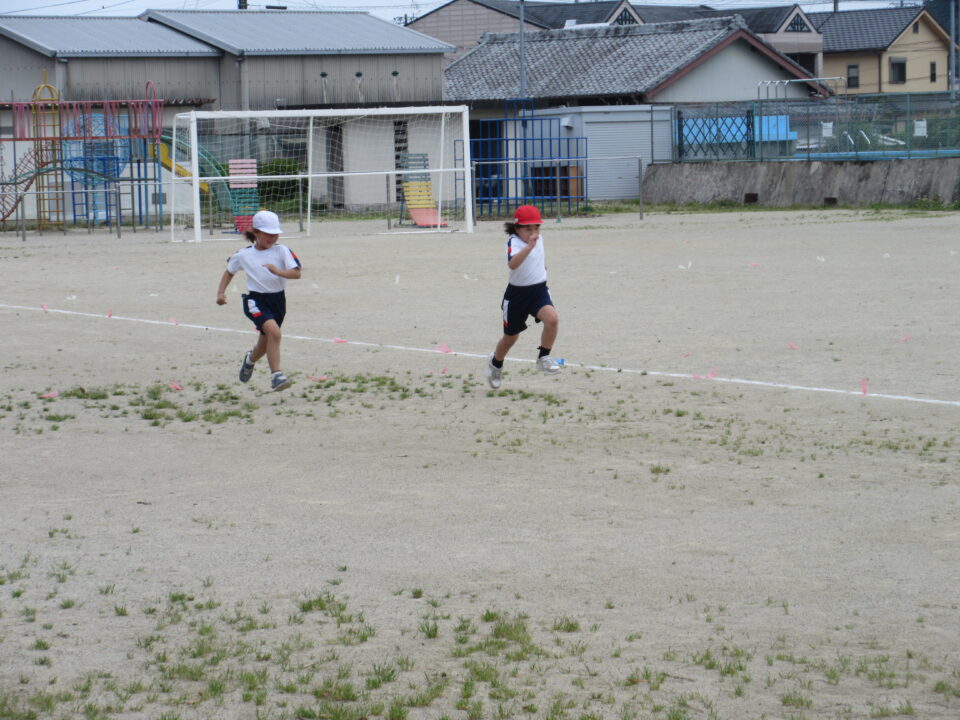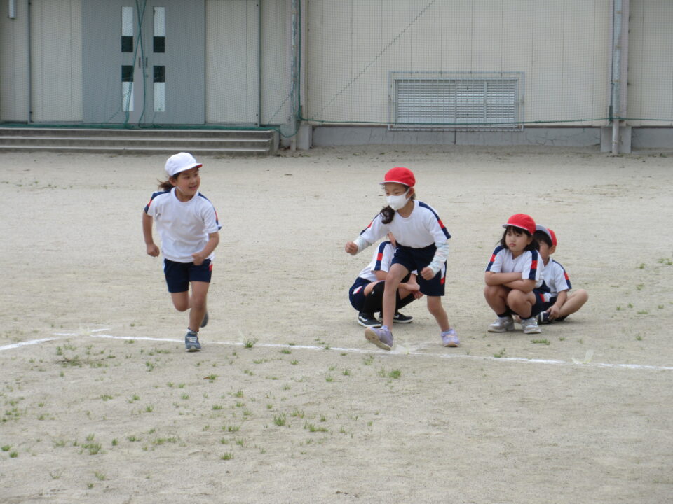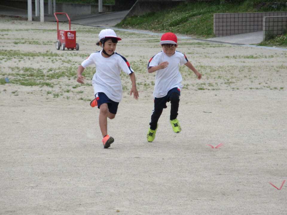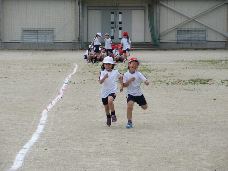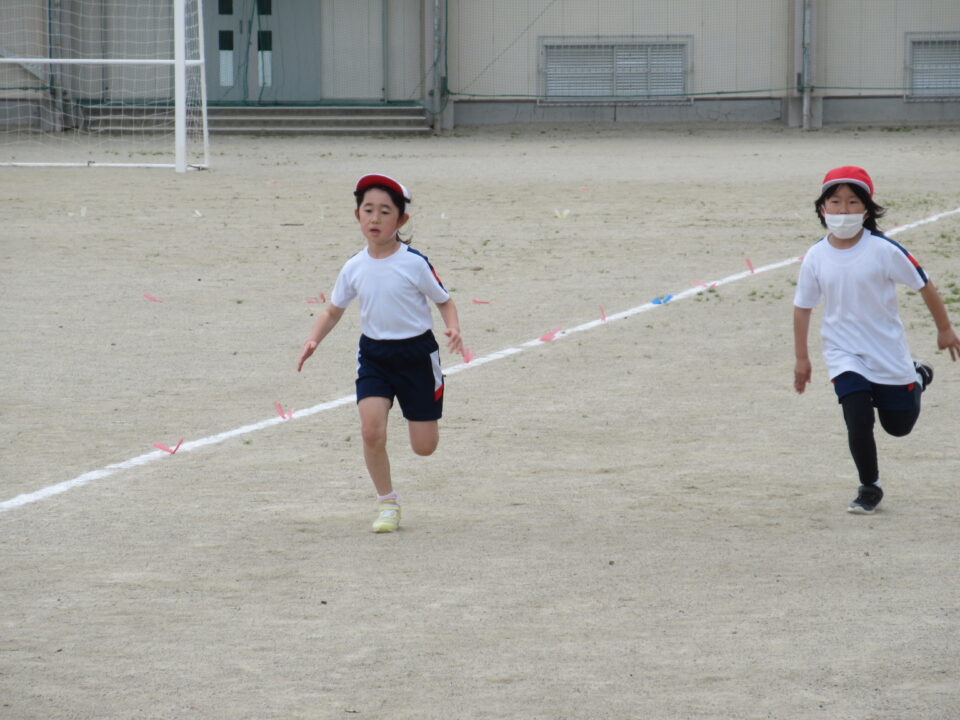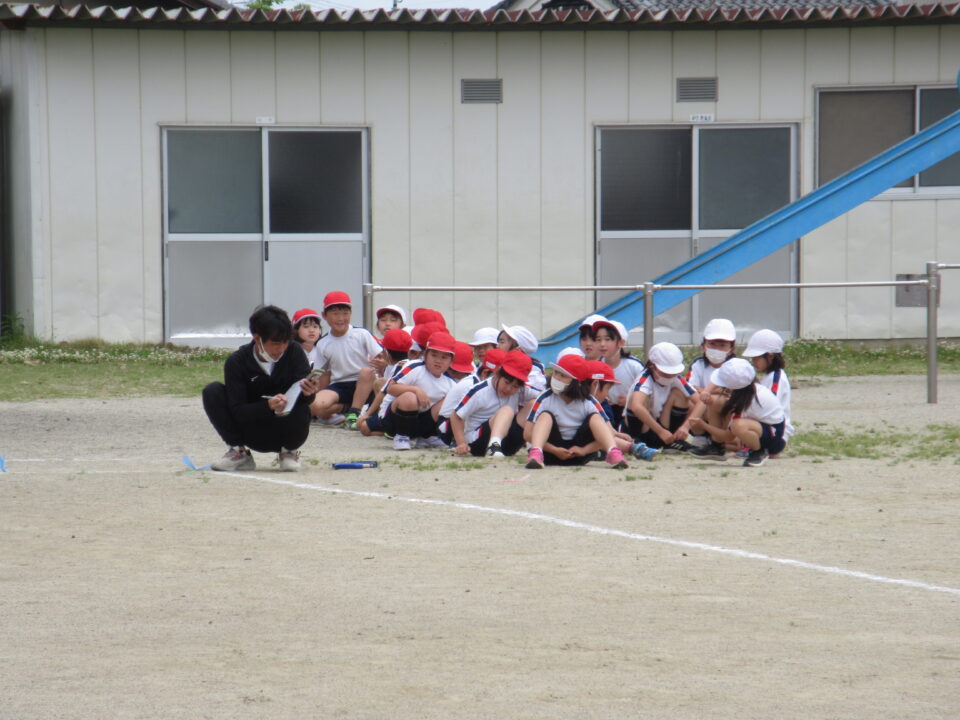 2年生。50m走です。みんな懸命に走る姿がとても格好良いです。頑張って走っている友だちに拍手や声援を送る姿も素敵です。先生も飛び入り参加しています。